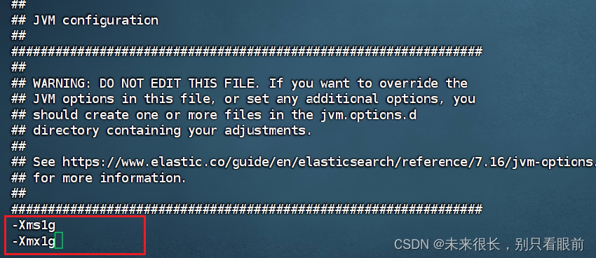 进入config后,使用vi指令编辑 jvm.options 文件,这里只能使用vi指令,容器内部是没有vim工具的。然后在下面添加你想要限制的内存大小,我添加的1g的内存限制,可以根据自己的云服务的配置来。