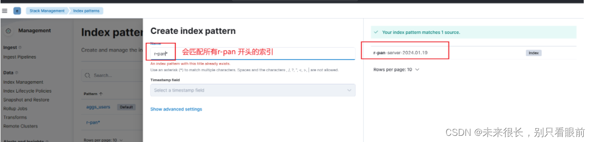 在kibana中对索引进行监控:使用通配符进行匹配的话,只要符合匹配的命名规则的索引都会被匹配进来,不仅仅是再局限于监控一个项目的日志信息。