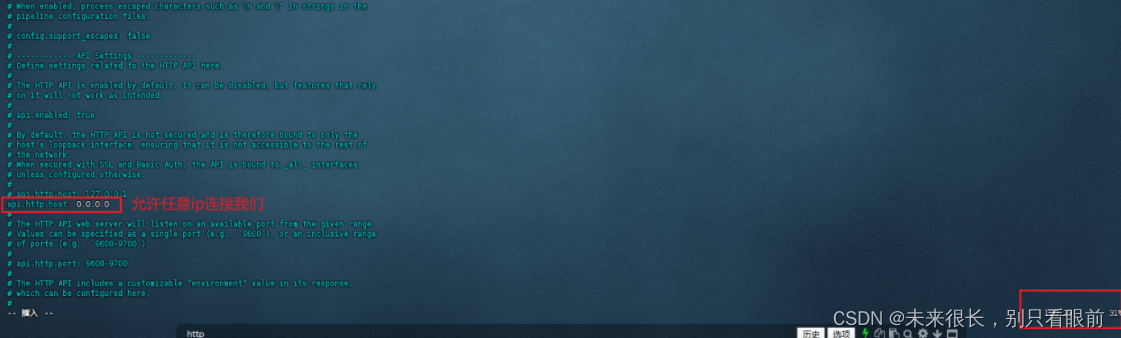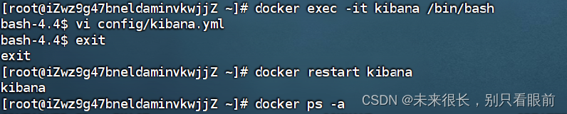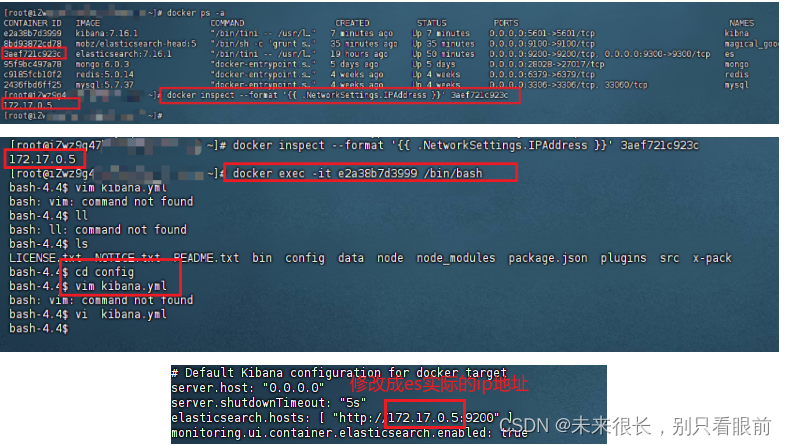 # 修改配置文件 vim使用不了的,使用vi 把刚刚获取的es在容器的实际ip地址覆盖掉配置文件中的ip地址