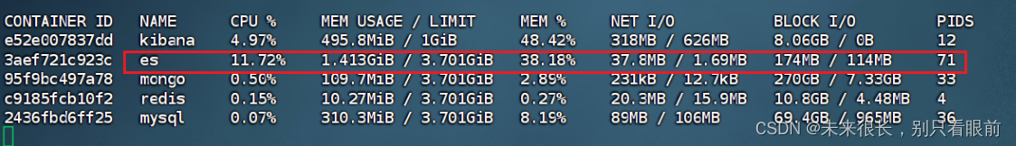 也可以使用docker state指令查看每个容器使用的内存,这里看到的是docker对容器的内存限制,如果在docker run容器的时候没有对容器的内存进行限制,那么它会默认使用服务器的最大内存为最大限制,在我没有修改jvm.options这个文件的时候,es使用的内存至少都是2.2g,目前得到了明显的控制。