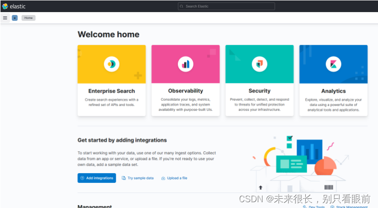 重启成功后,访问kibana,可以看到如下页面,并且输入账号 elastic,密码刚刚设置的密码可以登录成功,则表示kibana的密码也设置成功了。