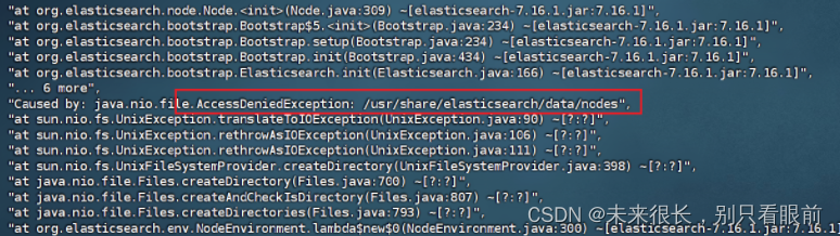 发现在报错:授权的问题,因为es启动是不能使用root的,以前使用源码安装的时候就是这样,必须要创建新的用户才行。所以这里也是一样的。我们需要为自己目录添加权限给es。