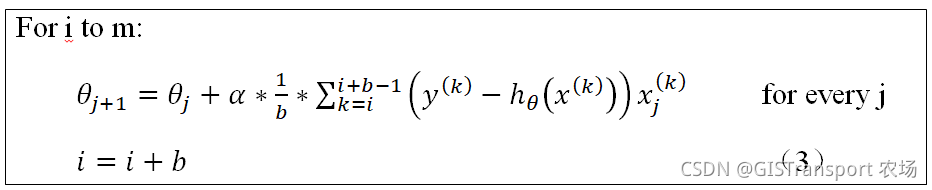 由于SGD单次只采用一个样本来参数进行更新,因此可能需要通过大量的更新到达局部最优点。因此作为BGD和GD的中间方案,提出了mini-batch GD 方法,该方法将所有样本分为多个min-batch(每个mini batch的样本数量大小为b),每一次采用b个样本进行参数更新。更新公式(3)如下