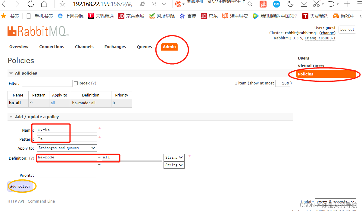 3.点击Add policy添加策略的,所以你还是得先配置普通集群,然后才能设置镜像队列.