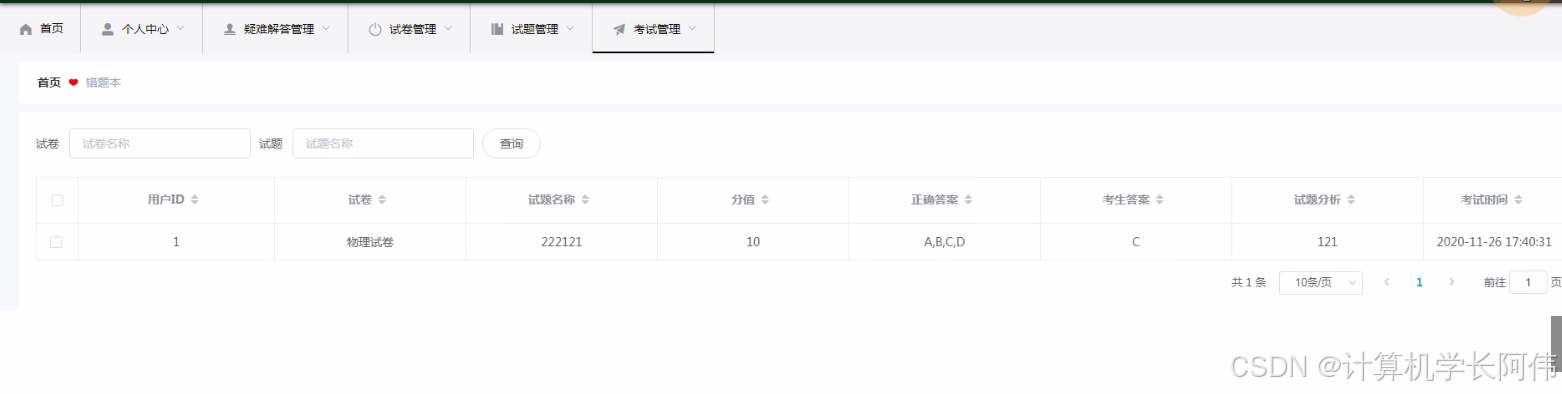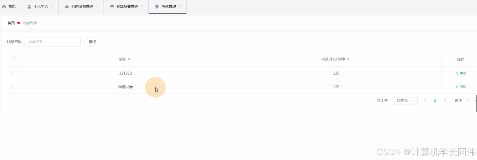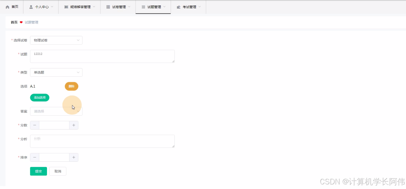 教师权限:首页、个人中心、疑难解答管理、试卷管理、试题管理、考试管理。