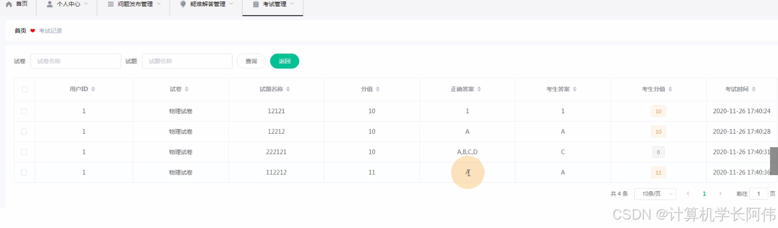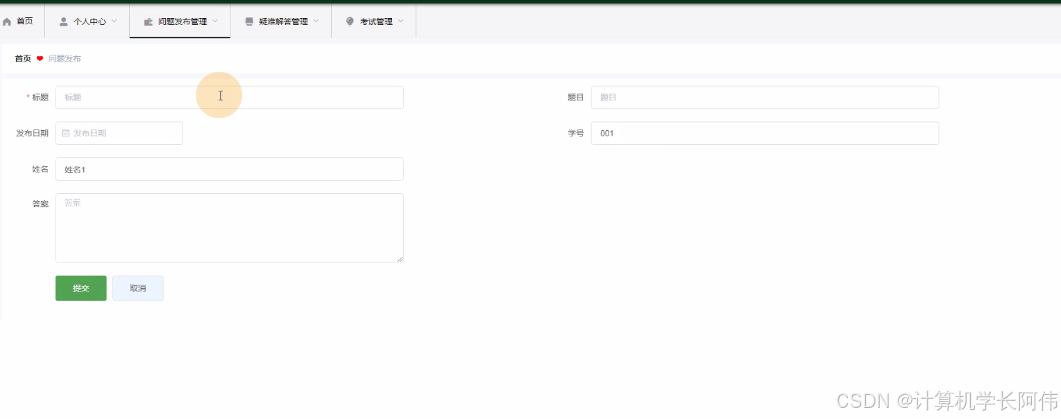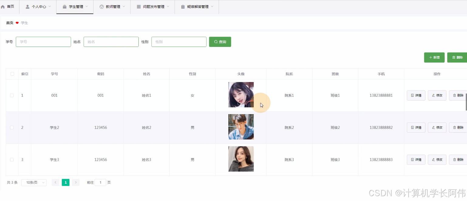 问题发布管理,学生通过问题发布管理可以在线查看标题、题目、发布时间、学号、姓名、答案进行详情并添加/修改、删除操作,如图5-11所示。