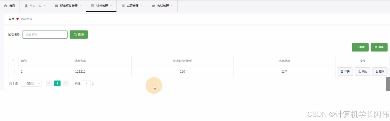 试卷管理:教师通过列表可以获取试卷名称、考试时长(分钟)、试卷状态,进行查看添加、修改等信息操作,如图5-7所示。