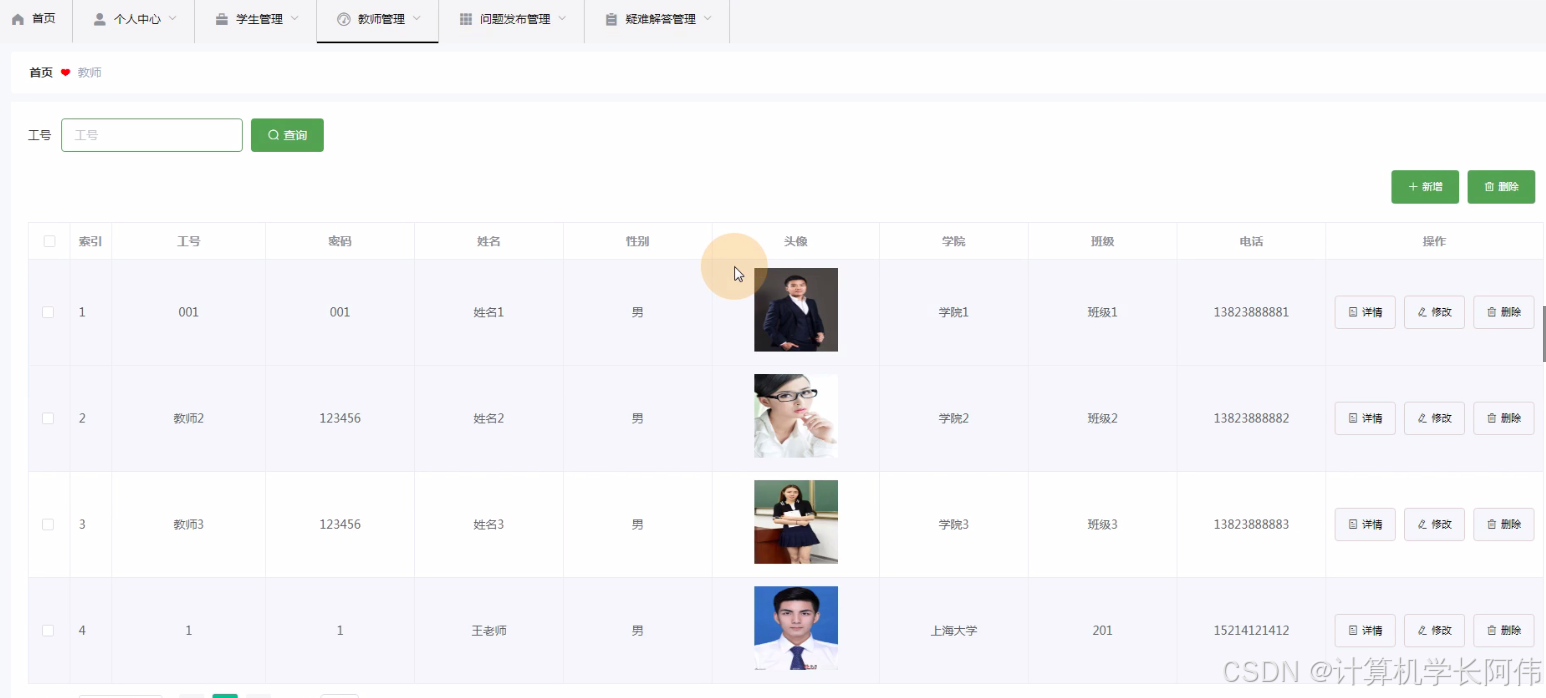 教师管理,管理员通过教师管理可以在线查看工号、密码、 姓名、性别、头像、学院、班级、电话等信息,进行查看或修改、删除操作,如图5-4所示。