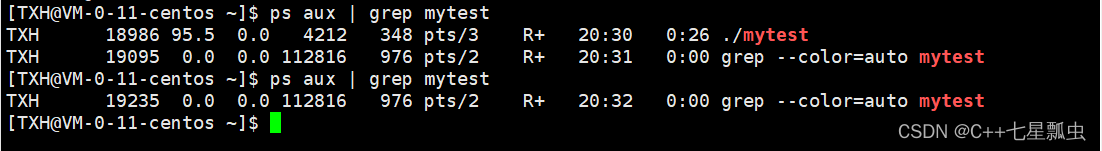 要查看自己写的代码进程信息,首先要保证代码的运行时间够长,如果运行时间太短,那么查看时进程就已经退出,查看不到了。以上代码中我使用了死循环,将test.c文件进行编译生成test文件运行后,使用命令 ps aux | grep mytest 就可以查看到进程信息。如果要停止运行,在执行的界面输入:Ctrl+c 就可以结束当前进程。