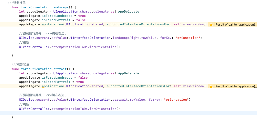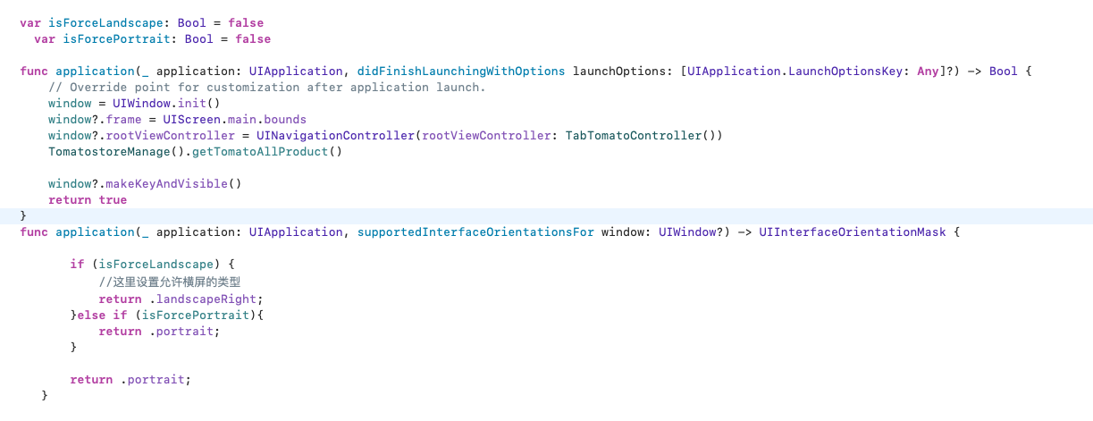 class AppDelegate: UIResponder, UIApplicationDelegate { var window: UIWindow? var isForceLandscape: Bool = falsevar isForcePortrait: Bool = false func application(_ application: UIApplication, didFinishLaunchingWithOptionslaunchOptions: [UIApplication.LaunchOptionsKey: Any]?) -> Bool { window = UIWindow.init(frame: UIScreen.main.bounds) window?.backgroundColor = UIColor.white window?.rootViewController =UINavigationController.init(rootViewController: ViewController.init()) window?.makeKeyAndVisible() return true }func application(_ application: UIApplication, supportedInterfaceOrientationsFor window: UIWindow?) -> UIInterfaceOrientationMask { if (isForceLandscape) { //这里设置允许横屏的类型 return .landscapeRight; }else if(isForcePortrait){ return .portrait; } return .portrait; } }
