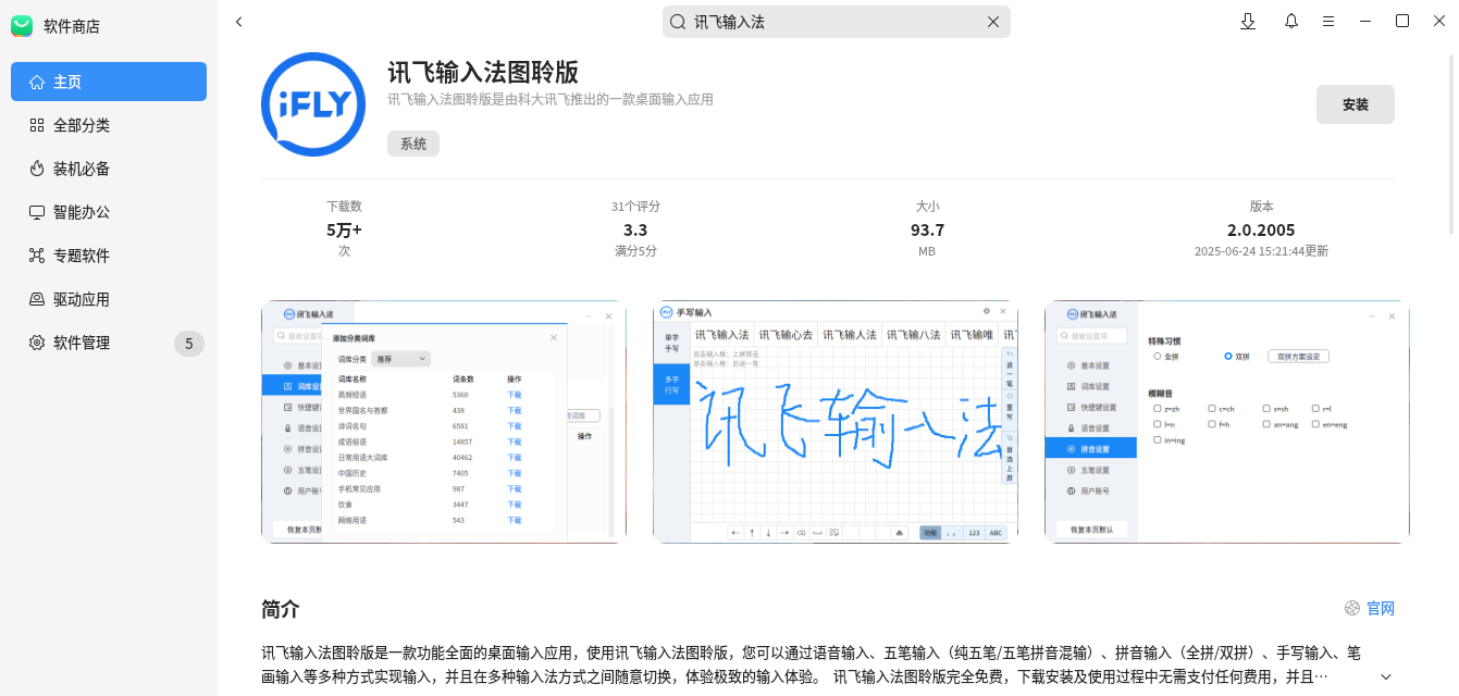 银河麒麟系统通常预装了官方软件商店,这是最简便的安装方式。打开“软件商店”,在搜索栏中输入“讯飞输入法”,如果官方源中有该包,直接点击安装即可(确保主机能访问公网)。