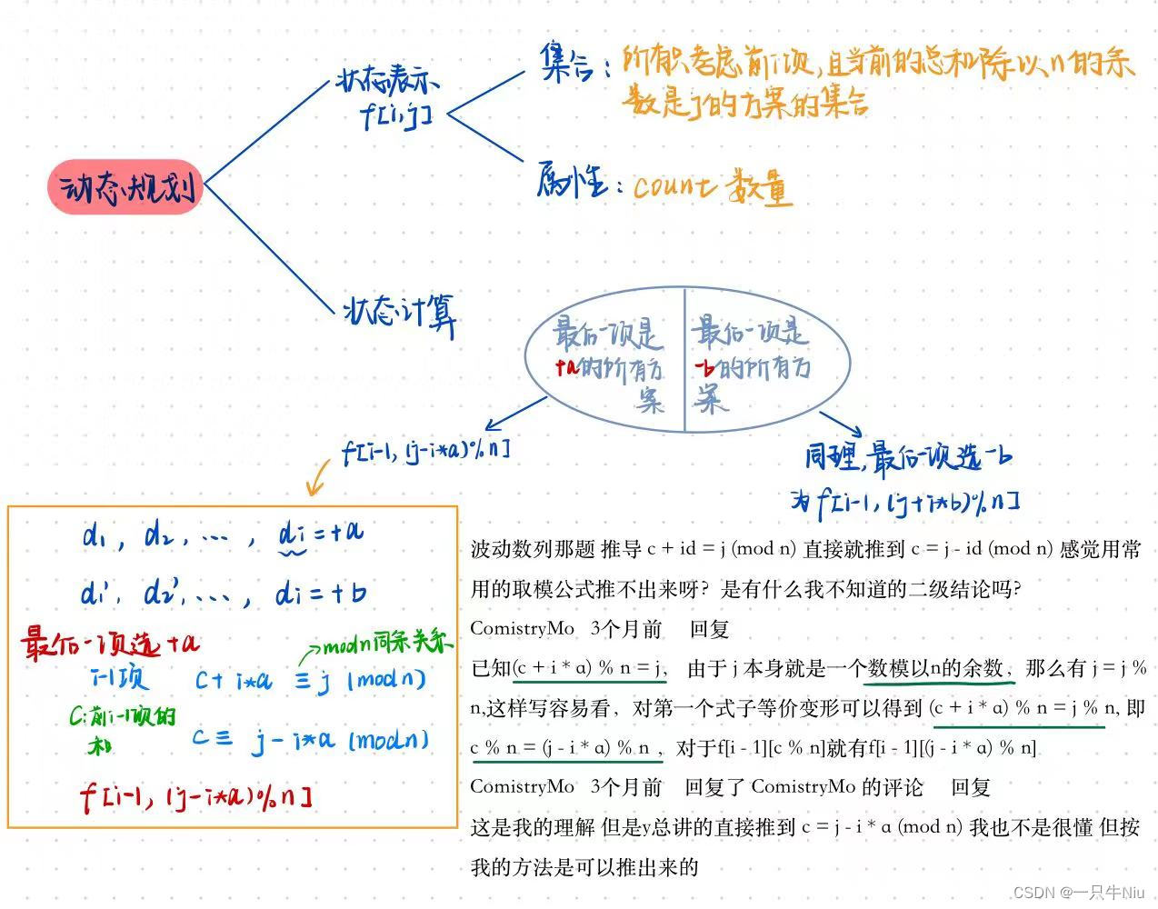 因为 f[i][j ]代表的是组合数量,因为 j-(n-i)a 是已经确定的数值,所以变化的数量在前面的和里面,可以推出 f[i][j]=f[i−1][(j−a(n−i))%n]