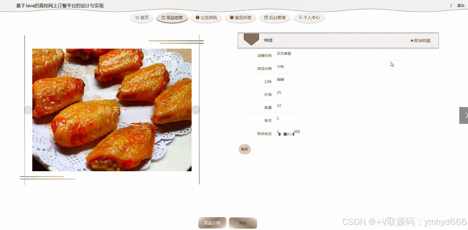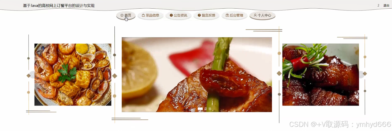 前台用户功能:浏览首页、菜品信息、公告资讯、留言反馈、后台管理、个人中心。