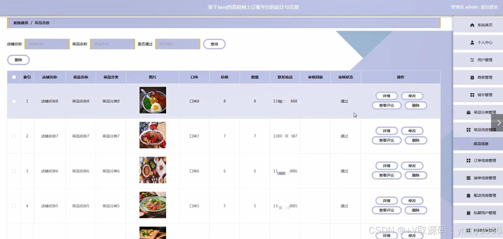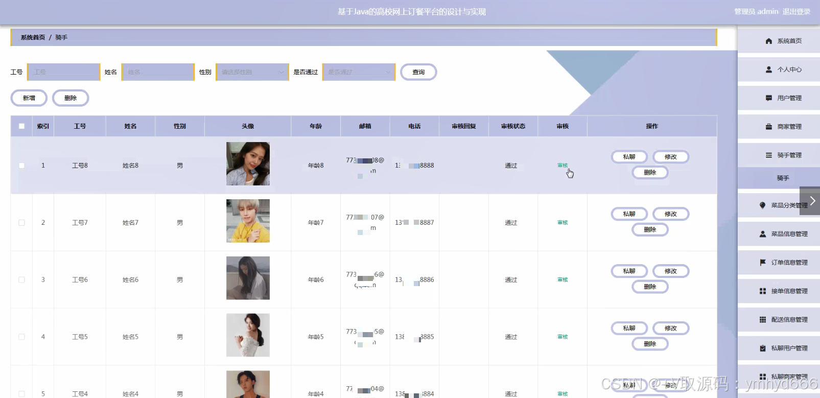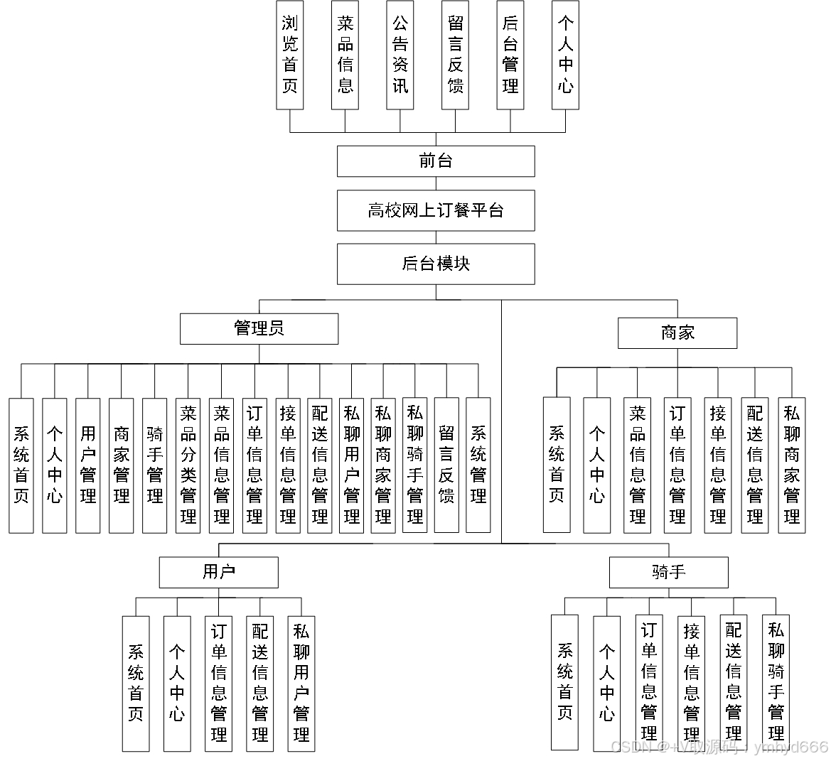管理员的功能:系统首页、个人中心、用户管理、商家管理、骑手管理、菜品分类管理、菜品信息管理、订单信息管理、接单信息管理、配送信息管理、私聊用户管理、私聊商家管理、私聊骑手管理、留言反馈、系统管理。