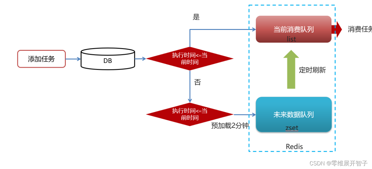 任务模块是一个通用的模块,项目中任何需要延迟队列的地方,都可以调用这个接口,要考虑到数据量的问题,如果数据量特别大,为了防止阻塞,只需要把未来几分钟要执行的数据存入缓存即可。