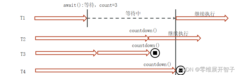CountDownLatch(闭锁/倒计时锁)用来进行线程同步协作,等待所有线程完成倒计时(一个或者多个线程,等待其他多个线程完成某件事情之后才能执行) 其中构造参数用来初始化等待计数值 await() 用来等待计数归零 countDown() 用来让计数减一