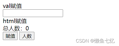 然后,我们定义了三个相关的元素,一个输入框和两个div元素,它们分别具有id属性"valfz","htmlfz"和"zrs"。这些元素将被用来展示和修改内容。并且写了两个按钮,赋值和人数来实现。