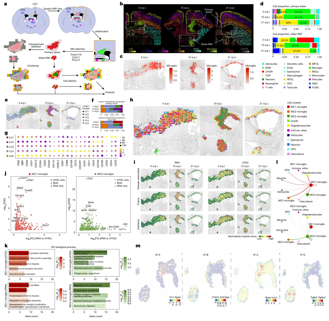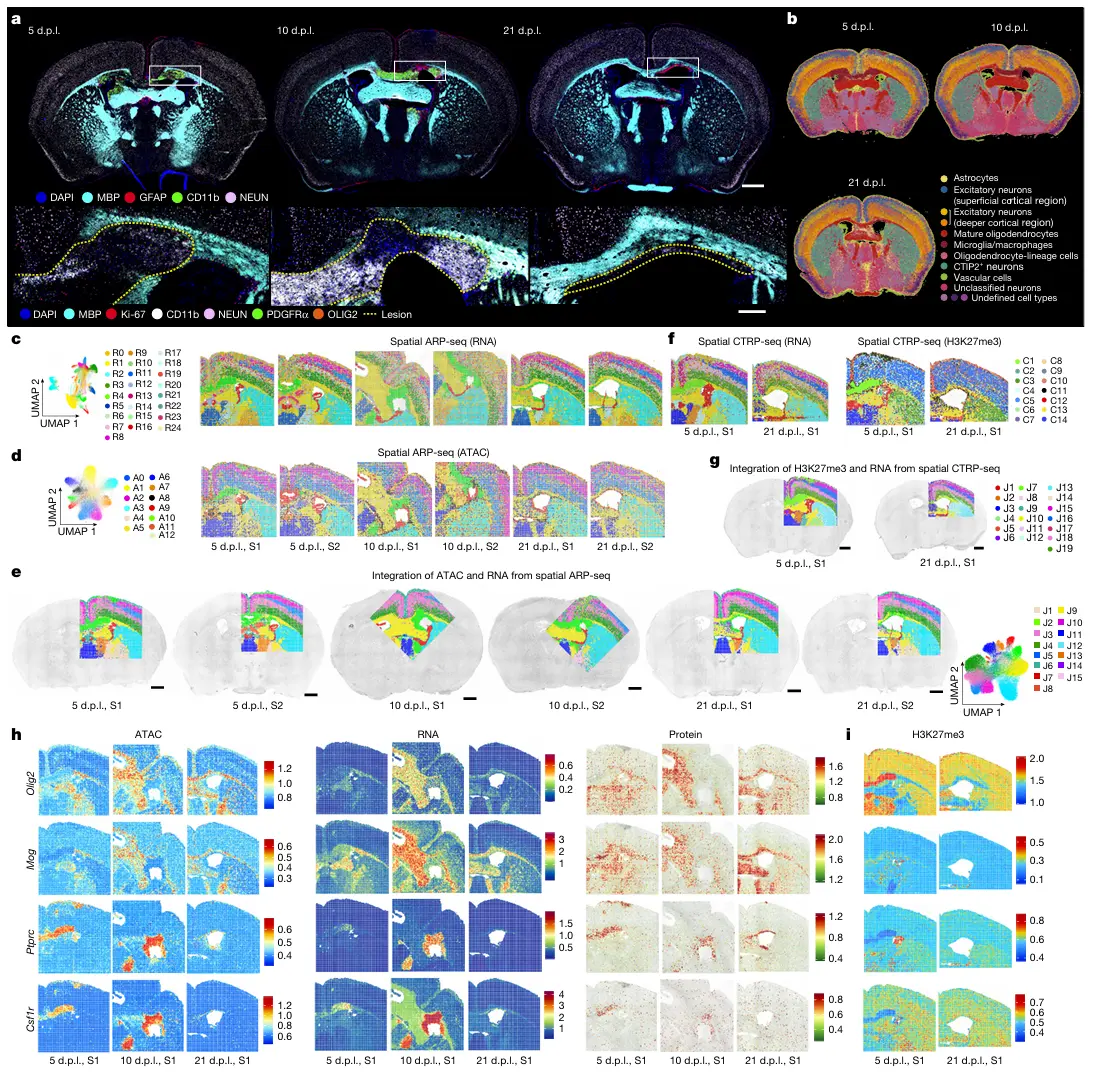 - 通过空间ARP-seq(分析RNA和染色质可及性)和空间CTRP-seq(分析H3K27me3组蛋白修饰和RNA),成功绘制了损伤后不同时间点的大脑精细分子图谱。