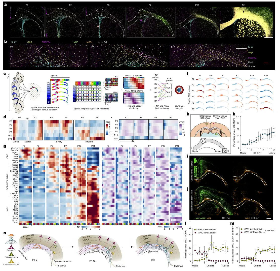 - 时空模式: CODEX和空间ARP-seq数据均证实,髓鞘蛋白MBP和MOG的表达在P7-P10天首先出现在胼胝体的外侧部分,到P21天时扩展至整个胼胝体,呈现出 “由外向内” 的进展模式。