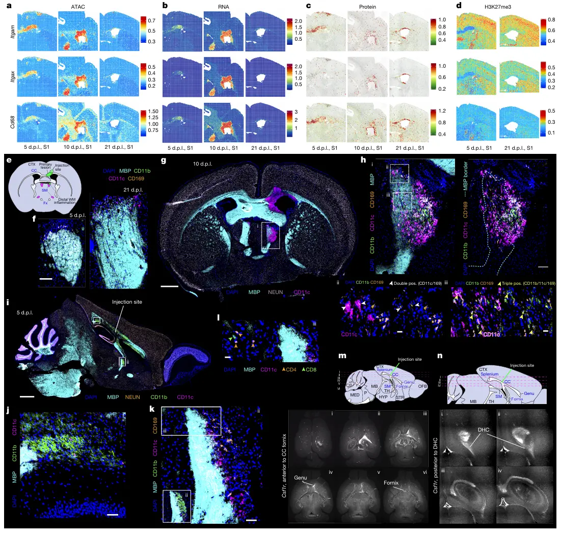 - 至21天,这群细胞从核心区撤退,但仍存在于残余的脱髓鞘区域。这种动态在RNA、ATAC和蛋白水平均得到验证,并与H3K27me3模式相反。