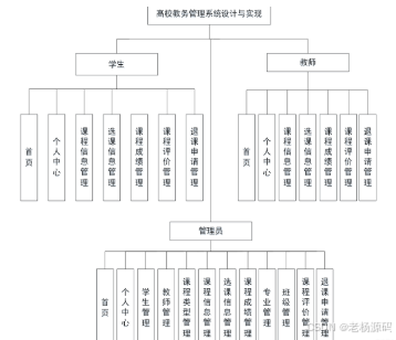 本论文主要完成不同用户的权限划分,不同用户具有不同权限的操作功能,在学生模块,主要有学生进行注册和登录,学生可以查看课程信息、选课信息、课程成绩、课程评价、退课申请等,还能修改个人信息等;在教师模块,教师添加课程信息或者审核信息等,在管理员模块,管理员可以对学生信息、教师信息、课程信息、选课信息等进行相应的操作。