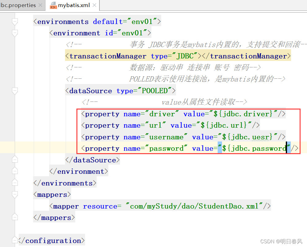 <property name="username" value="${jdbc.uesr}"/>