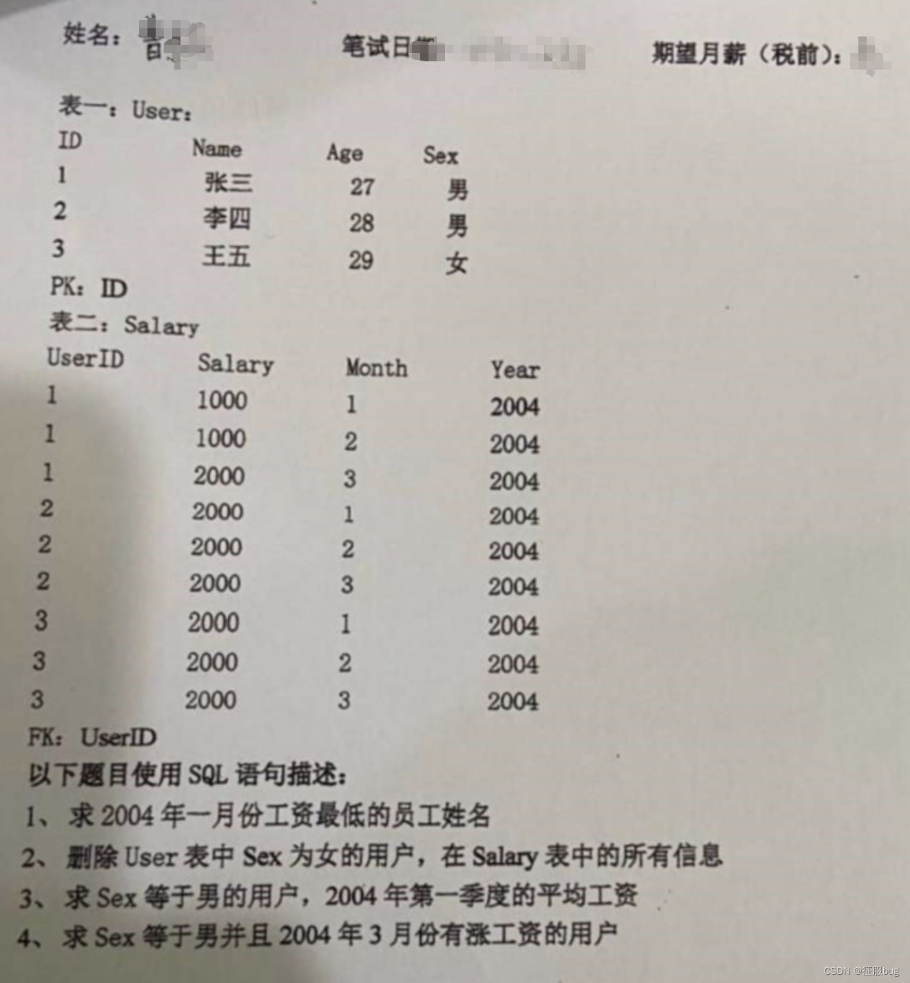今天突然一个朋友给我突然给我发了一份建立,他选择还是在职状态,但是没事的时候他就喜欢投投简历,来更了解现在的工资行情,他是一个智能AI运维工程师,周日的时候呢,他接到了一家小企业的面试要求,还是线下,到了之后人事简单问了一些工作方面的问题,然后就给他丢过来了一张关于SQL的题,但是这个题我第一眼一看好简单啊,可以在我做的时候确不如此,废话少说,我们来帮他做一下吧。