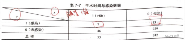 某医院为了研究导致手术切口感染的原因,收集了295例手术患者的情况。其中,手术时间小于或等于5h的有242例,感染者13例;手术时间大于5h的有53例,感染者7例。如表所示。试建立手术切口感染(v)关于手术时间(x)的逻辑回归模型。