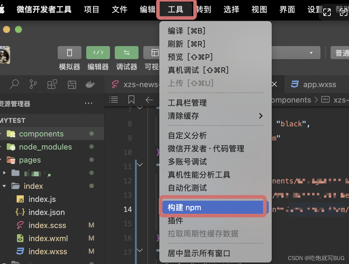 在微信开发者工具左上角找到 工具→ 构建npm。构建完成后,即可引入组件