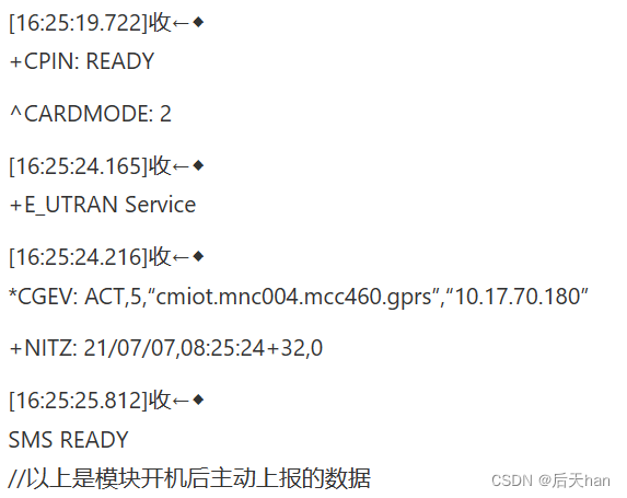 Air724ug模块连接不稳定 要不然可能导致收不到AT\r这条指令==模块无法响应。每次上电以后,都会返回这些数据,大概会有5s的反应时间。解决办法:设置时间,我设置的是20s发送一次命令。所以要留出一些时间,不能直接连接。