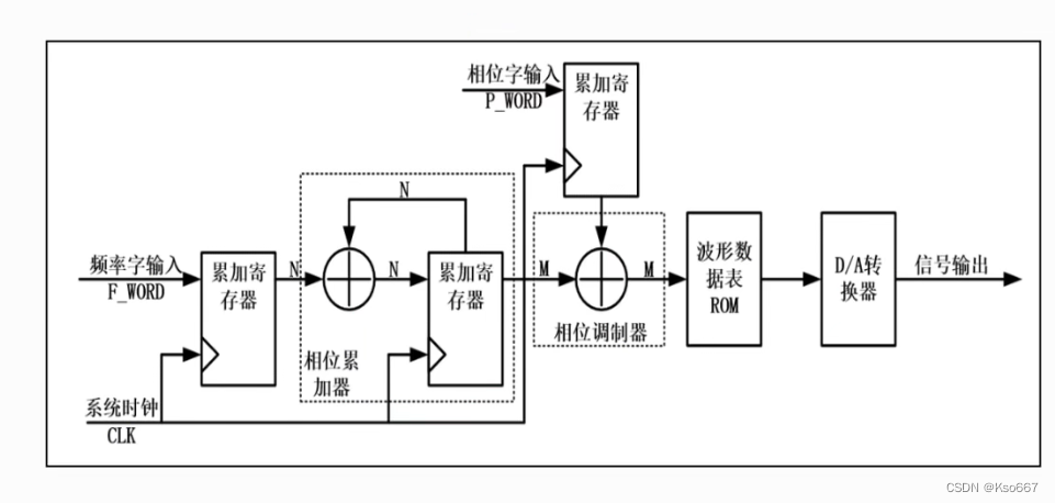 图中:频率字输入F_WORD和相位字输入P_WORD共同调节输出信号的频率,有如下关系: