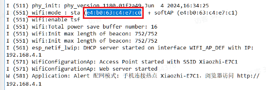 在输出信息中下拉耐心查找即可,找到 wifi:mode : sta ( ) 所在行,找到xx:xx:xx:xx:xx:xx,即为当前小智产品的MAC地址了。
