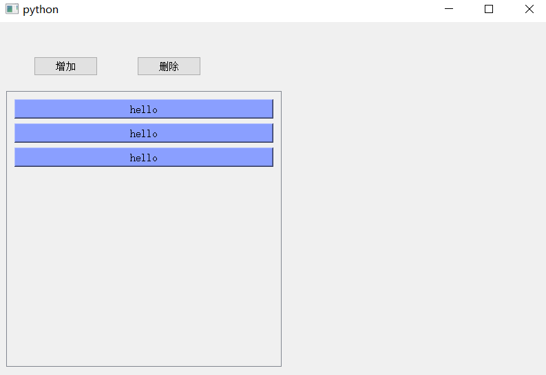 点击“增加”按钮,在scrollArea中会新增出一个名为hello的按钮,持续点击则持续增加,当增加到一定数量时,scrollArea会出现滑块。同理,点击“删除”按钮,则会由下至上删除名为hello的按钮,持续点击则会持续删除。(截图如下)