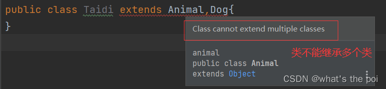 Java中不允许多重继承。extends后面只能跟一个父类,不允许多层继承,没法当儿子,可以当孙子。