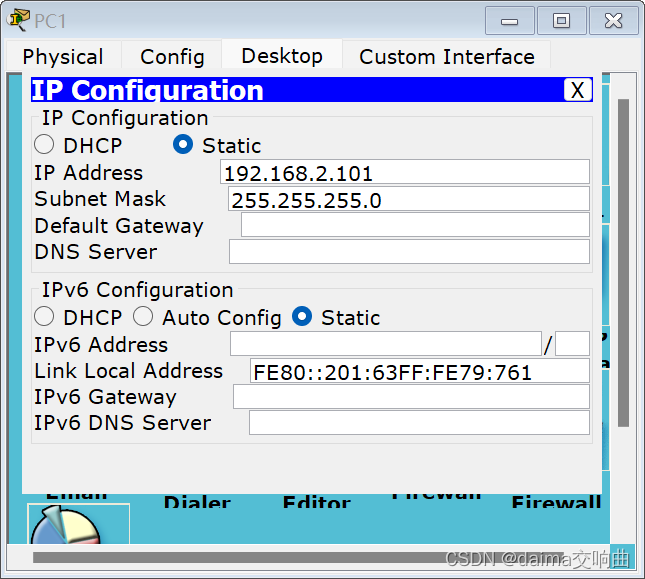 - 左键点击PC机,点击desktop,点击IP Configuration,进入配置