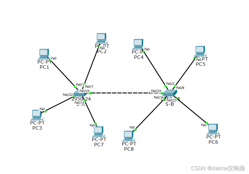 放置2台交换机,6台PC机,其中PC与交换机之间使用直通线连接,交换机与交换机之间使用交叉线连接。(按照要求中设置连接端口或者直接根据下面的图配置即可)