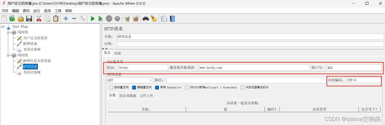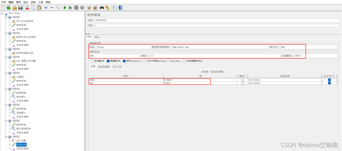 要求使用JMeter发送一个GET请求,请求地址为https://www.baidu.com/S,第一个用户携带参数为:name=张三&age=28; 第二个用户携带参数为:name=李四&age=30