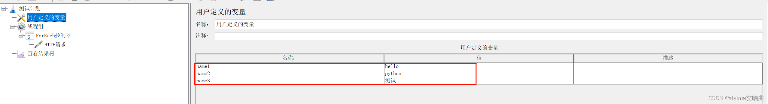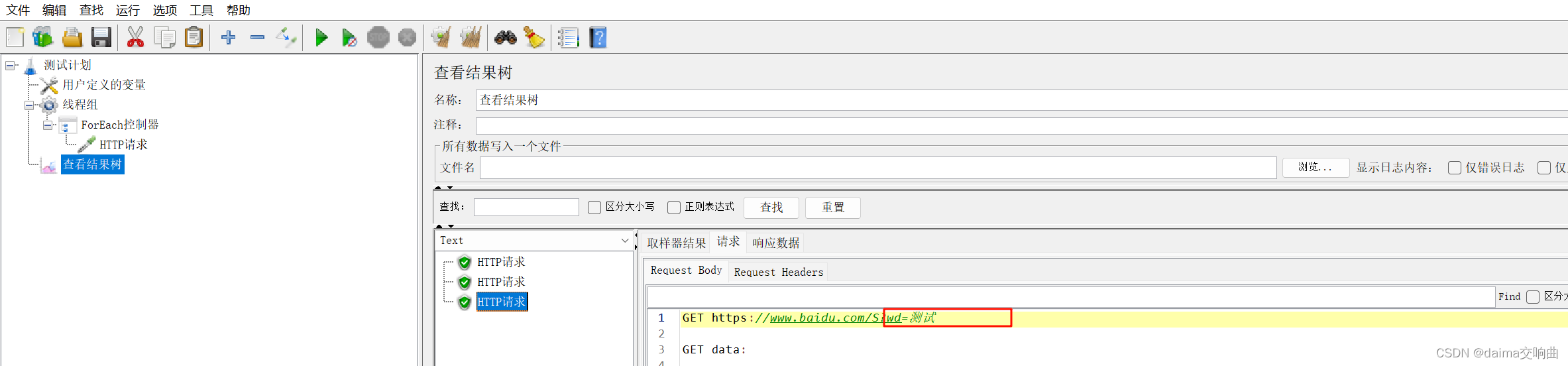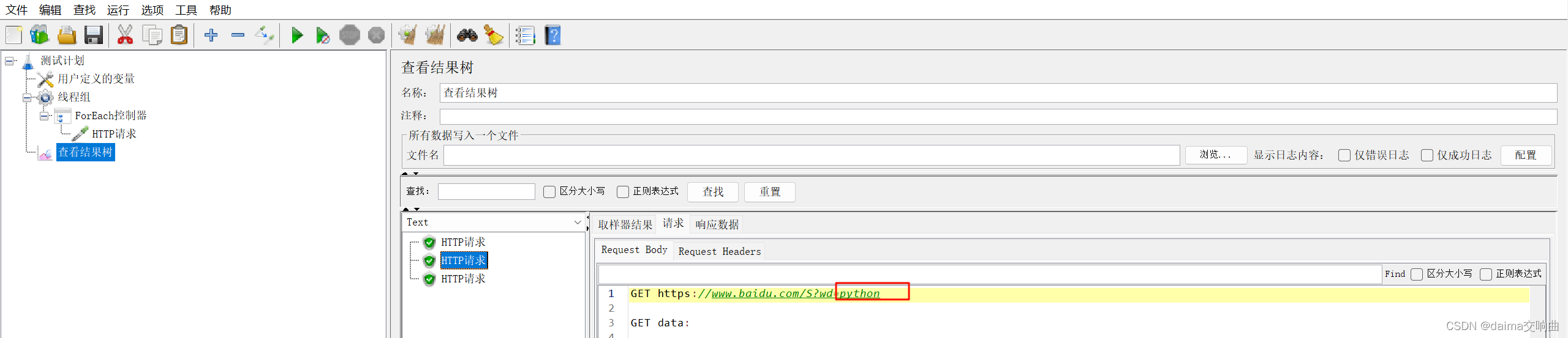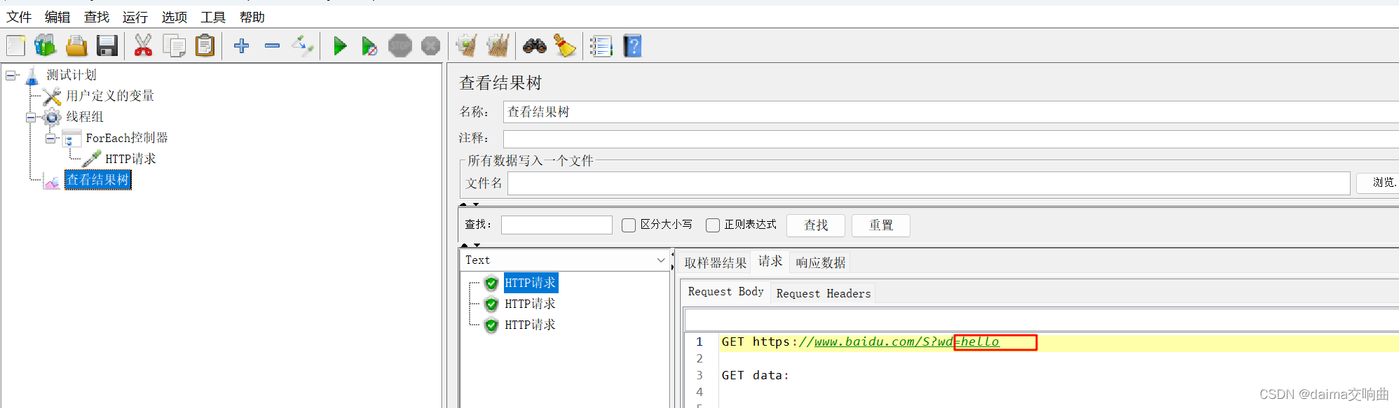 本案例要求使用用户定义的变量定义一组关键字:hello、pyhton、测试。依次取出这一组关键字,将其作为请求参数请求百度网站(https://www.baidu.com/S?wd=hello)。