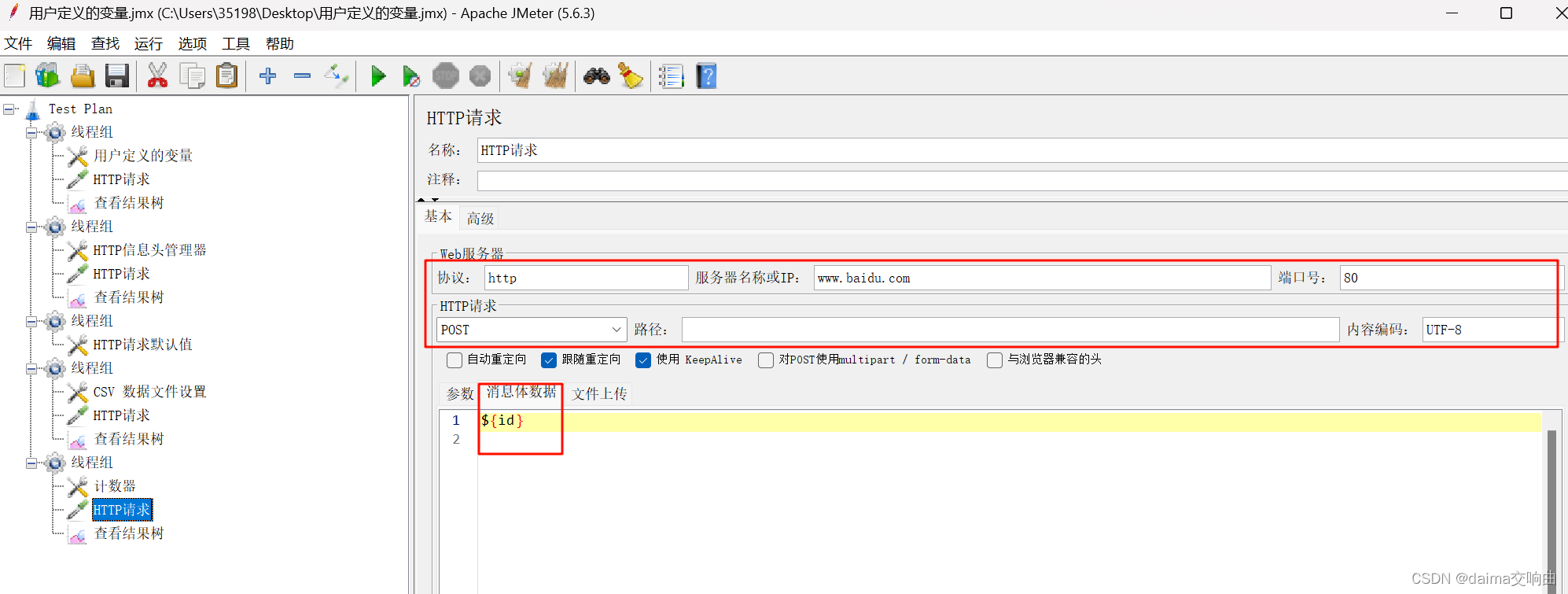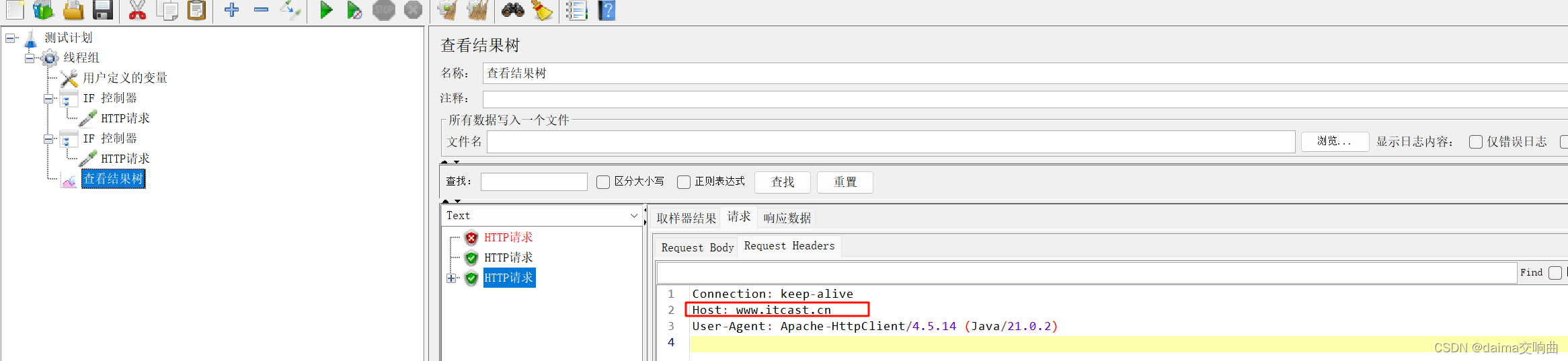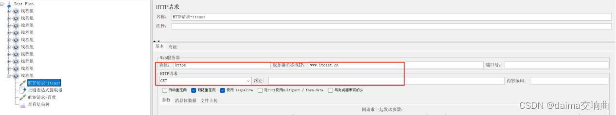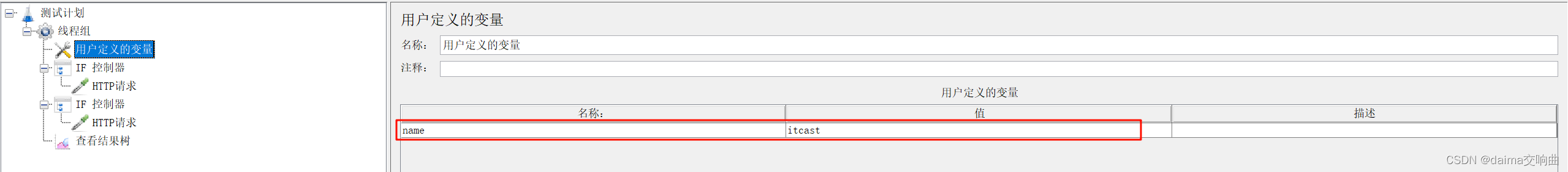 本案例要求使用用户定义的变量定义一个变量name,name有两个可选值:baidu和itcast。如果name的值为baidu,则请求https://www.baidu.com;如果name的值为itcast,则请求https://www.itcast.cn。