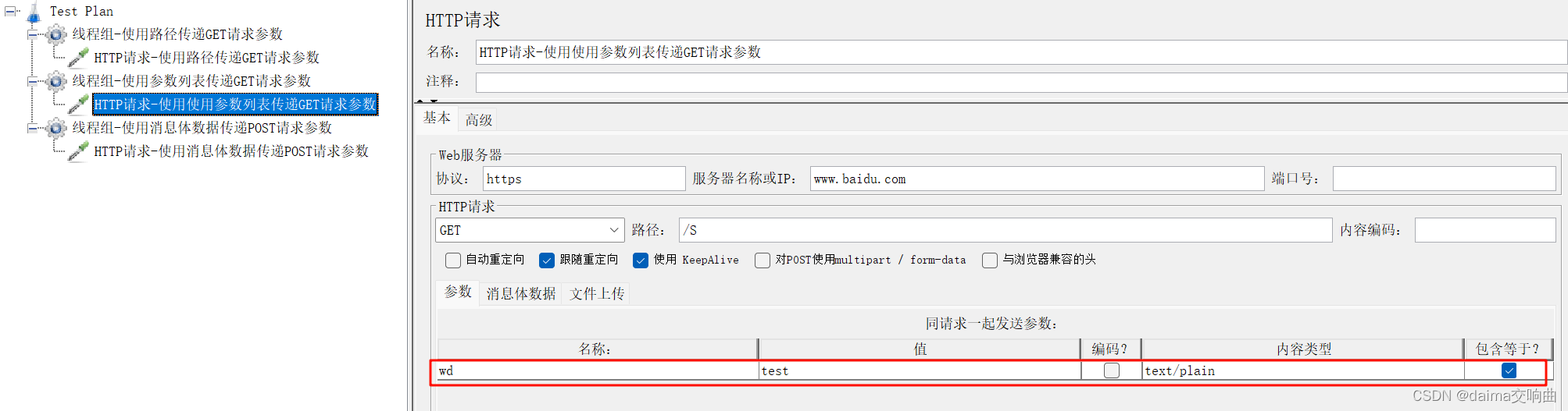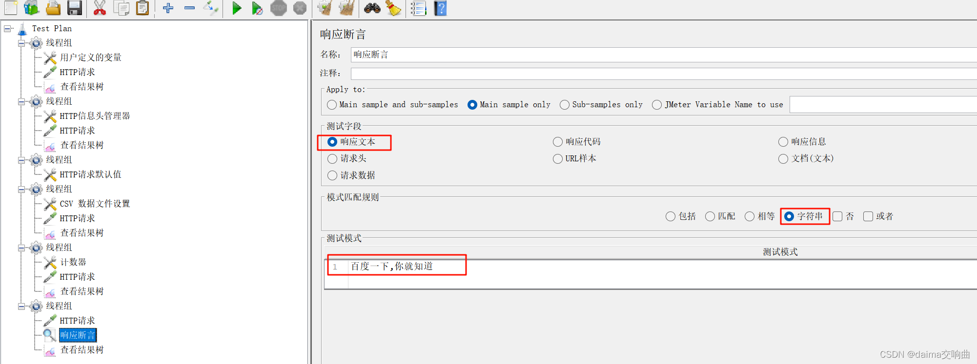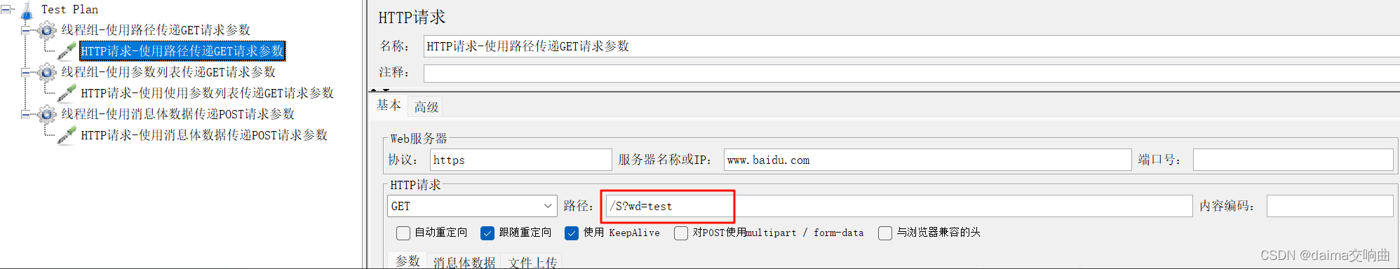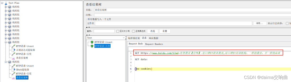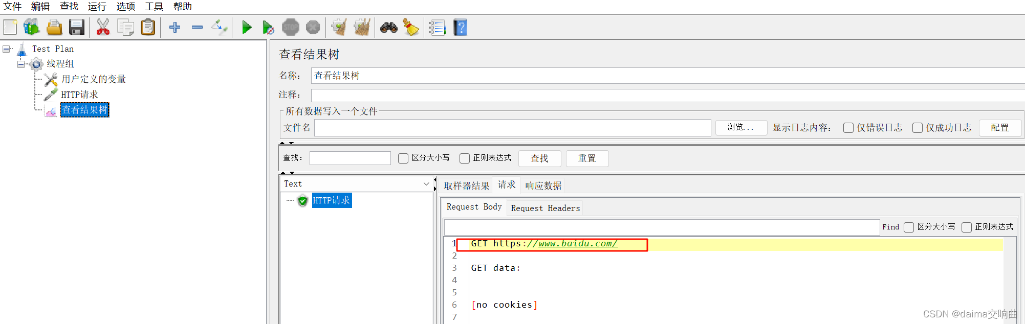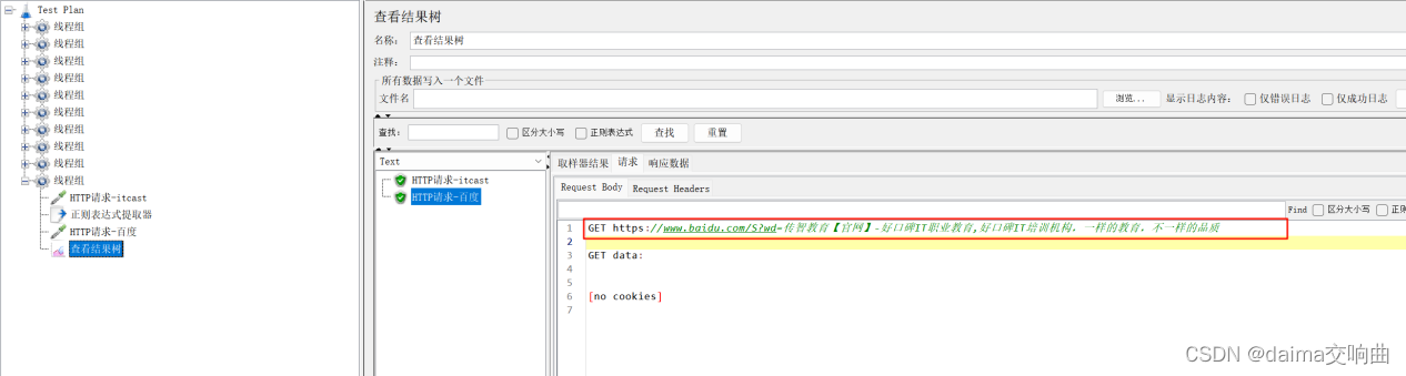 案例:要求使用JMeter发送一个GET请求,请求地址为http://www.baidu.com,检查响应数据中是否包含“百度一下,你就知道”字符串