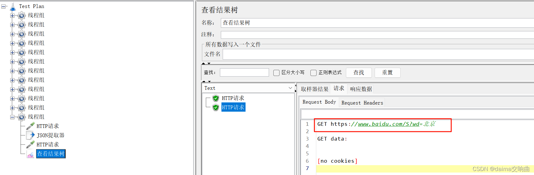 请求二:请求地址为https://www.baidu.com/S,把请求一的<title>标签的值作为请求参数。