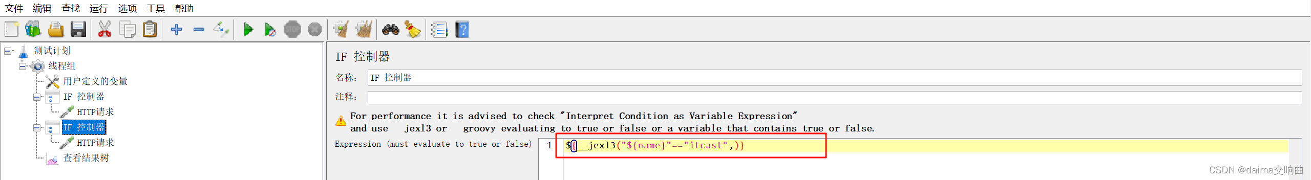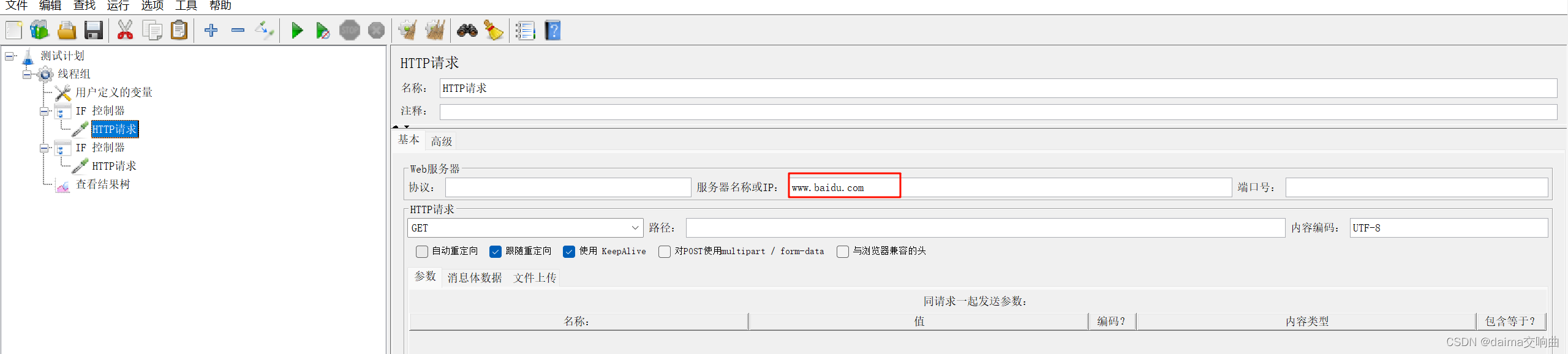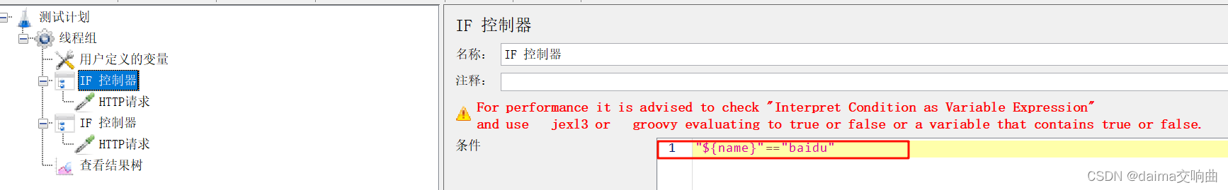 分析上述要求,根据 name 的值判断发送哪个请求,需要使用如果(If) 控制器实现。确定了核心元件之后,构建测试计划目录树,如下图所示。
