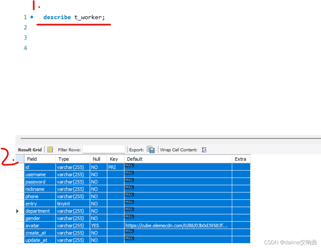 1. describe 表名; 显示表结构2. 选择表进行复制3. 打开WPS,粘贴。4.点击上方插入选择表格,依据需要内容行列数进行创建。5.选择sql表列或者行,进行复制。6.按照行或者列粘贴至WPS表格。