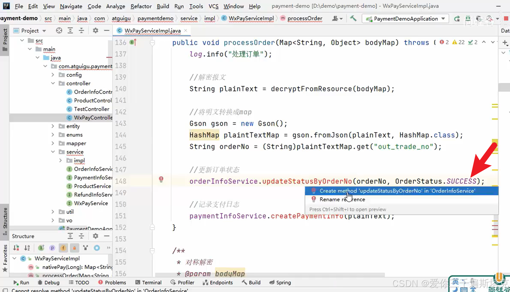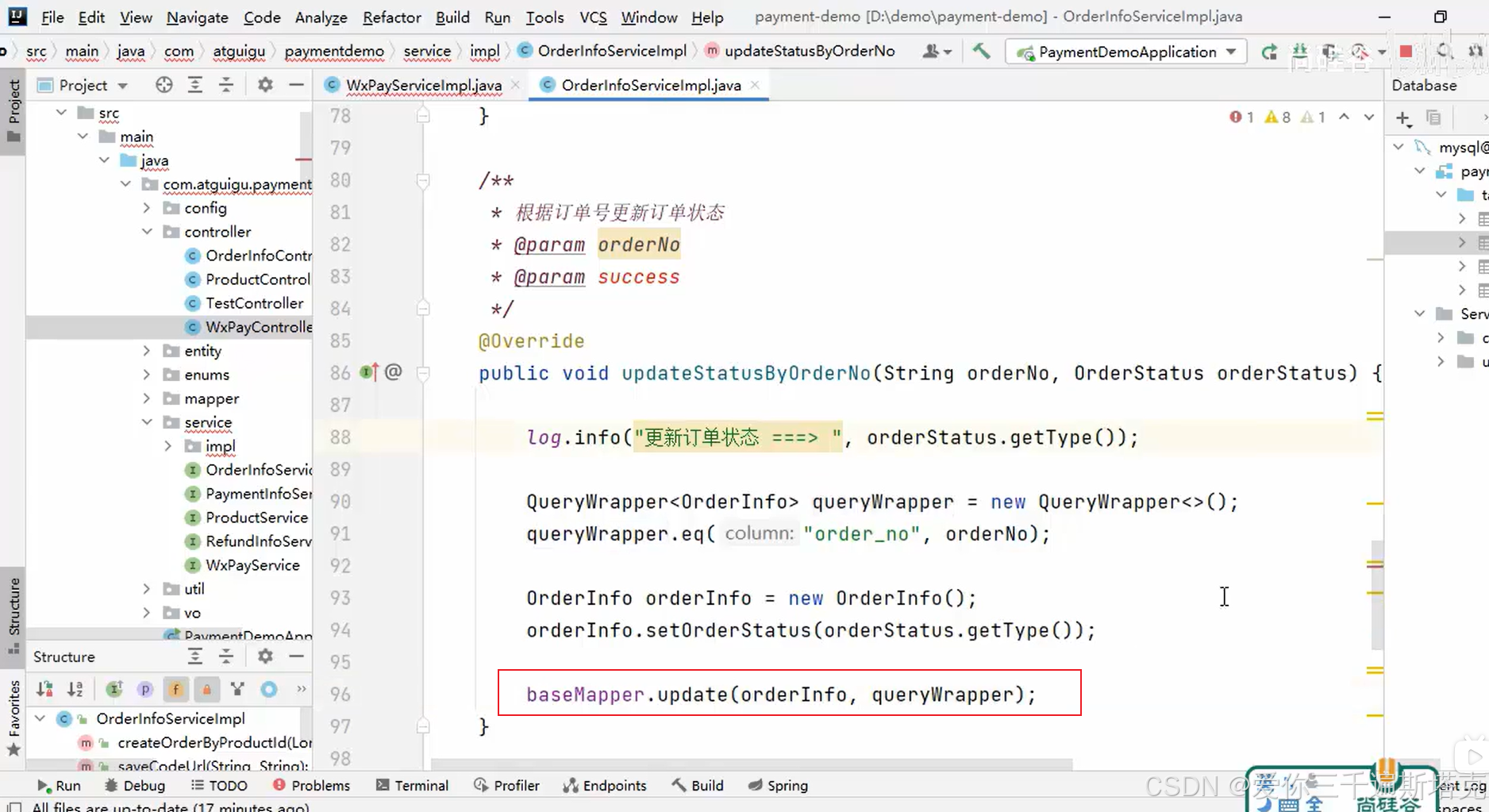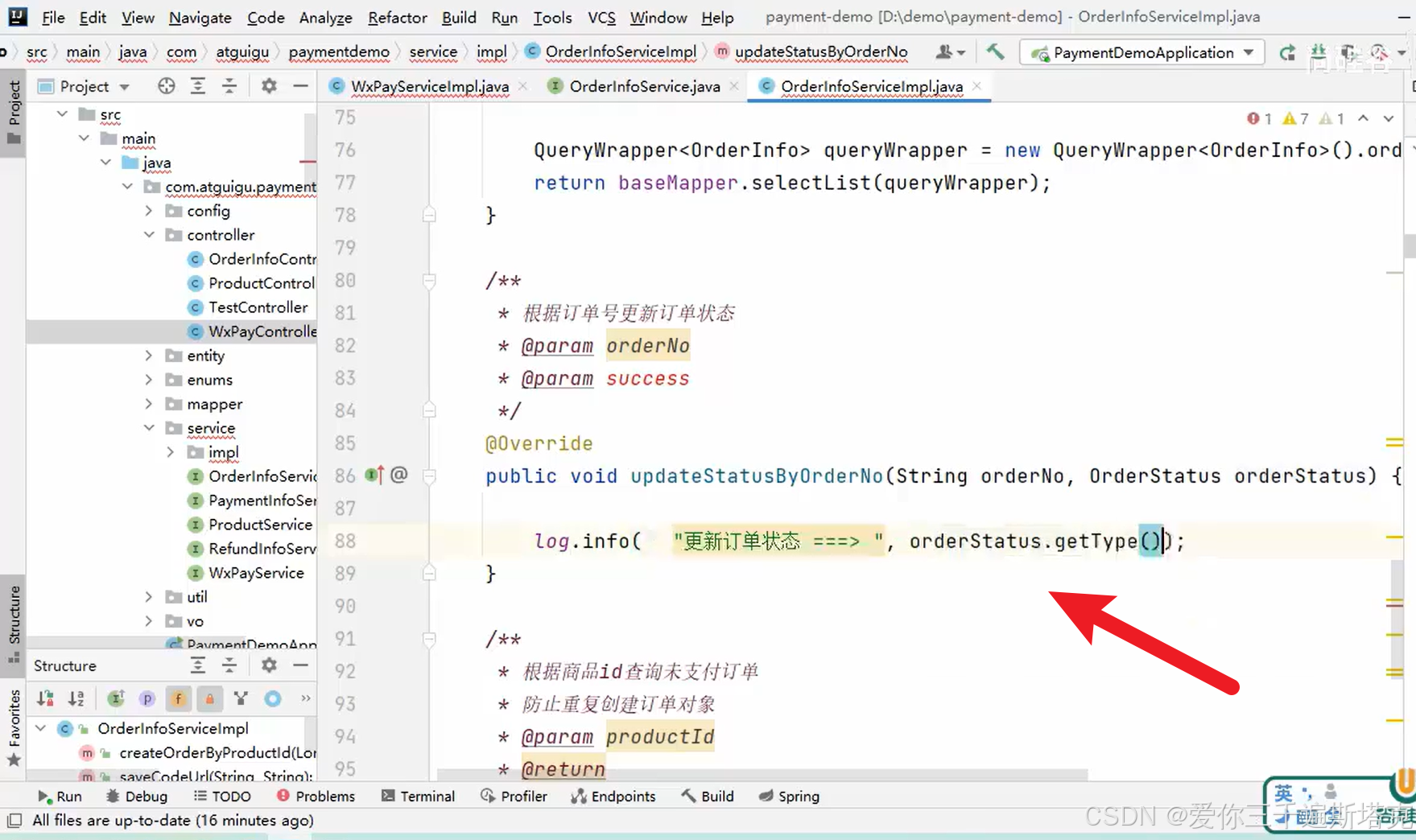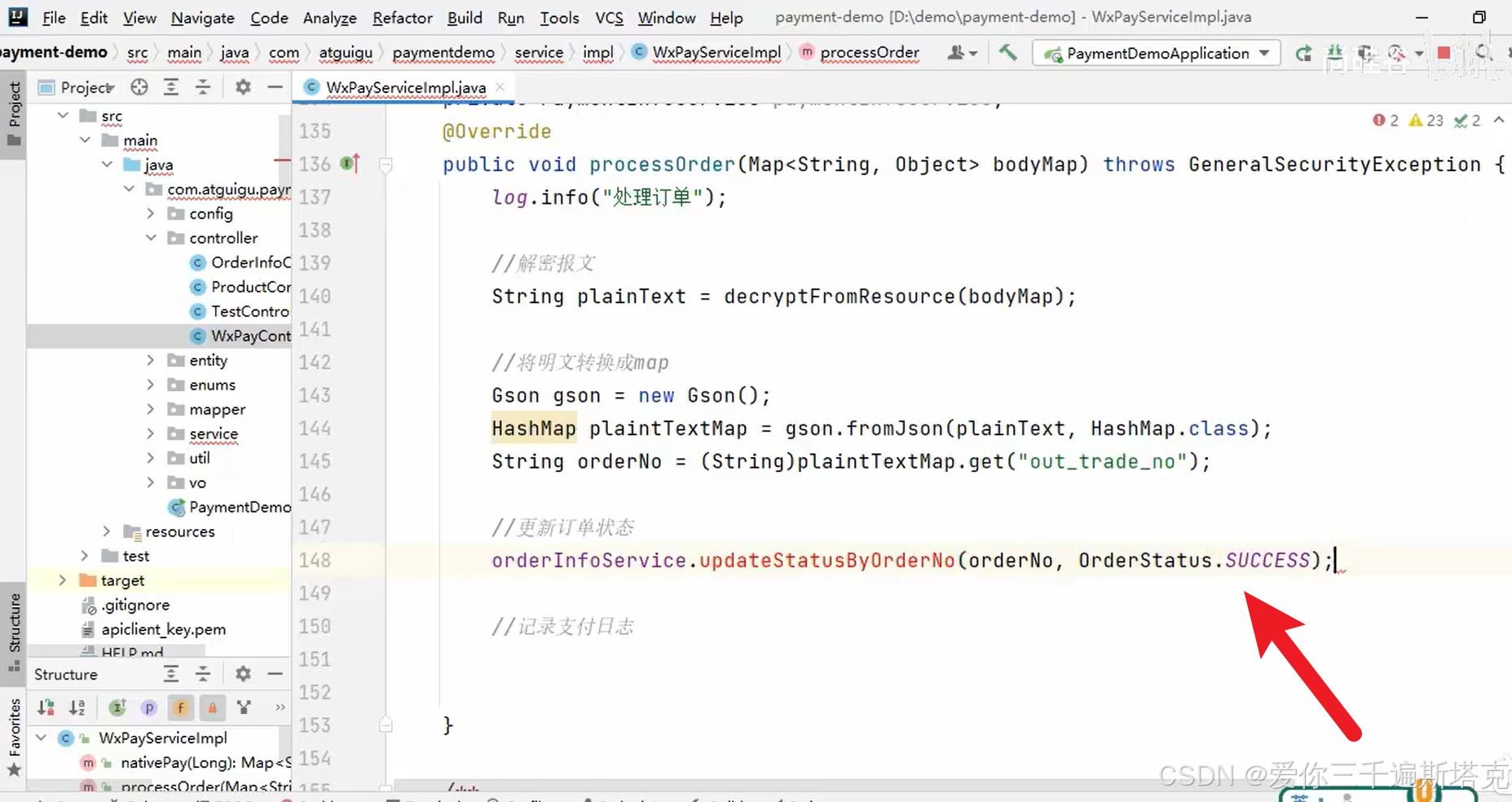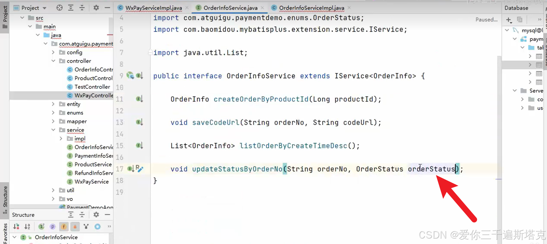 接下来更新订单状态,利用枚举传入一个支付成功的状态