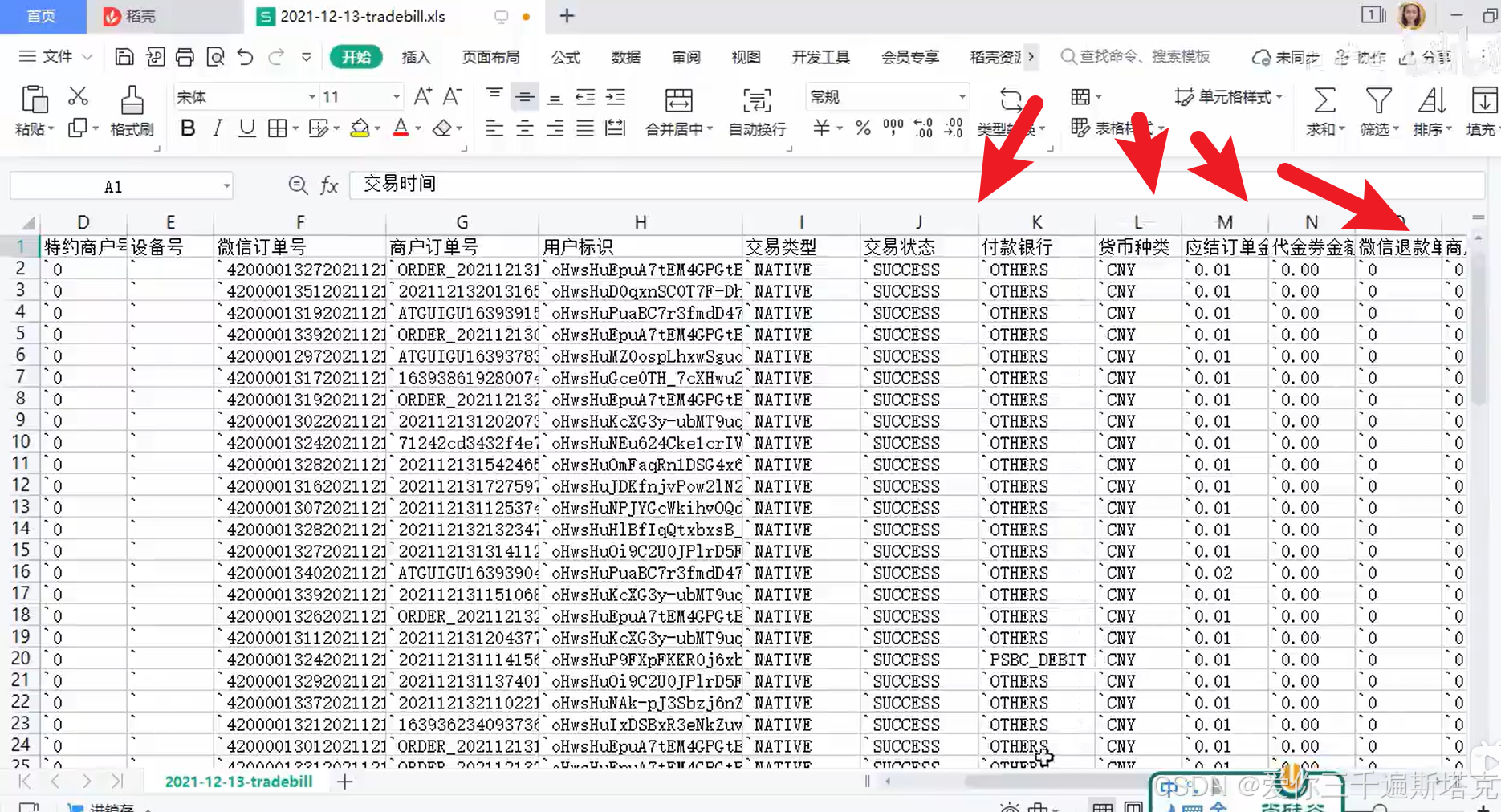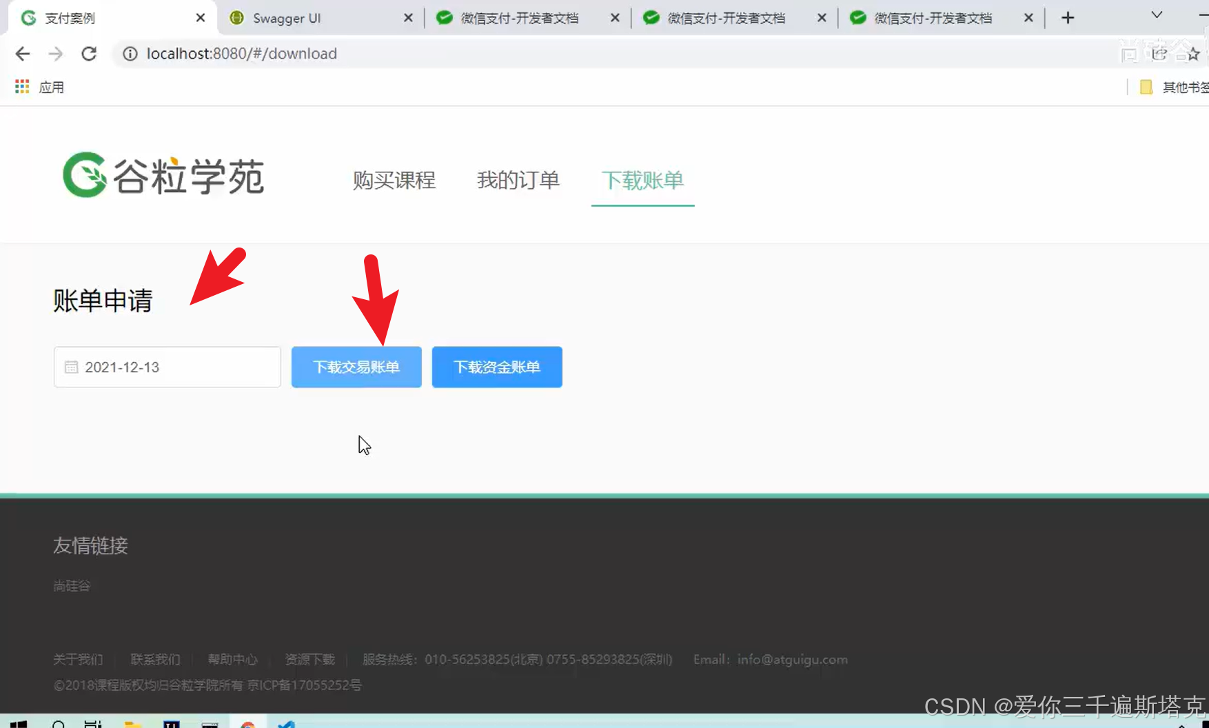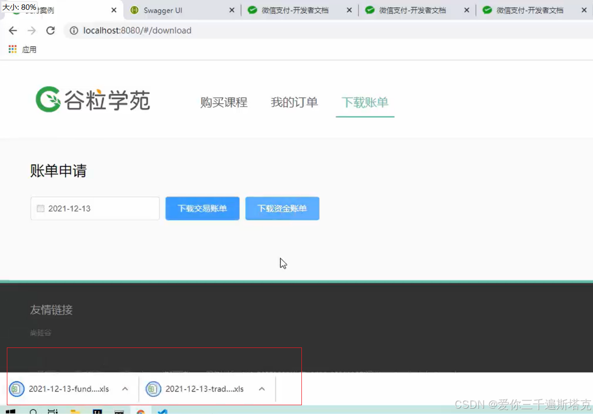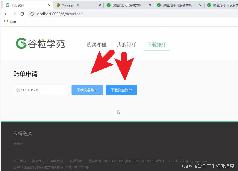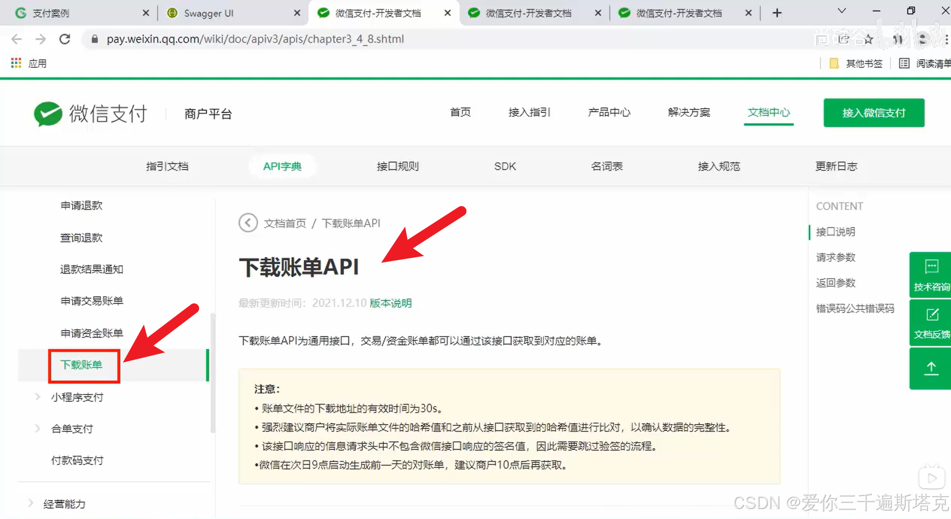还有一个功能是下载账单功能 可以下载资金账单,也可以下载交易账单 这里可以下载一个账单申请 可以下载交易账单,也可以下载资金账单 点击下载实现账单下载 发起支付的用户的唯一标识 交易状态,记录支付的每笔交易状态,有的是成功 以及付款的银行和其他的信息 资金账单只有每一笔银行的流水