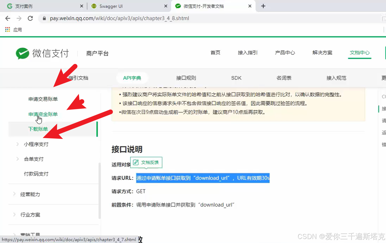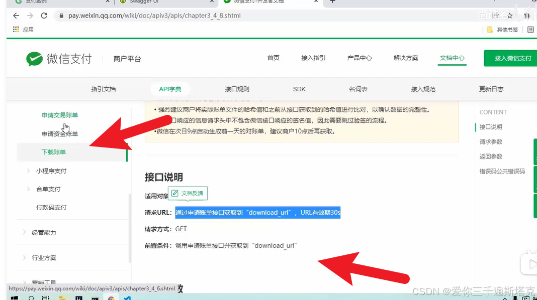 想要调用下载账单,必须先调用申请交易账单和申请资金账单的结果,调用结果之后