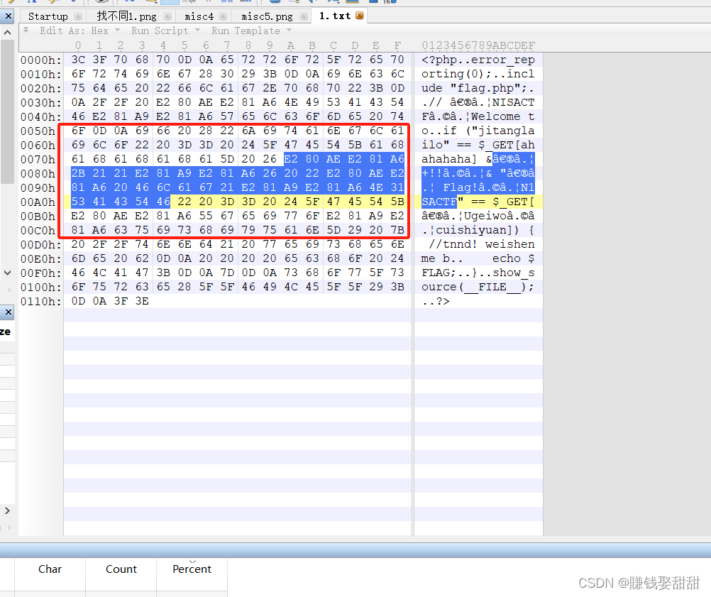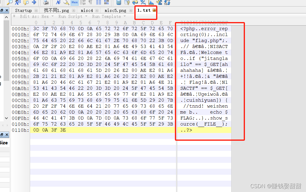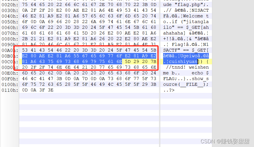 审计代码,题目需要我们上传两个变量的内容,根据题目输入,结果没有出现flag,题目有提示,复制源码,用010Editor打开
