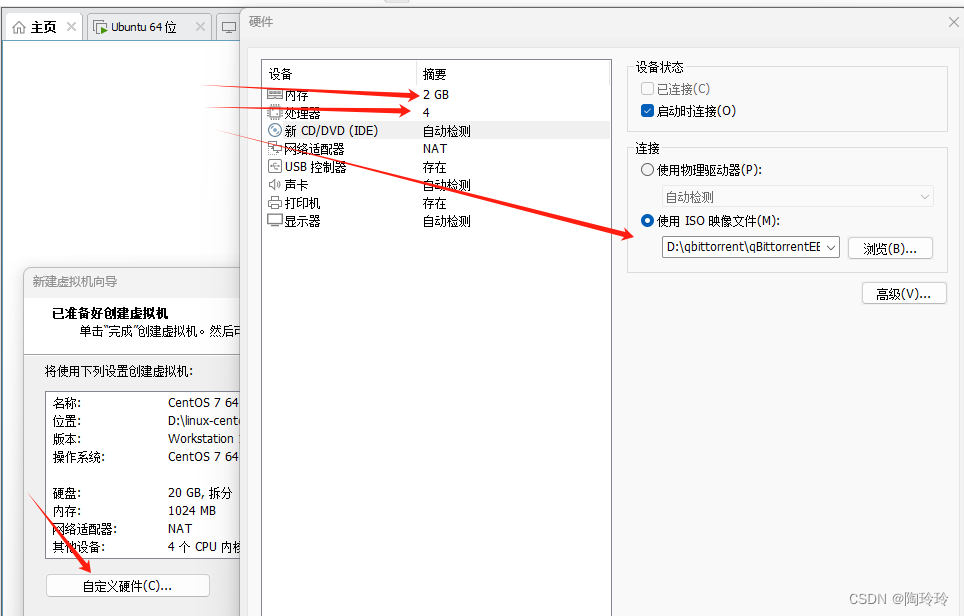 总之,检查一下图上箭头标注处。按照自己需求,配置内存和处理器,iso映像文件(盘)一定得记得放。