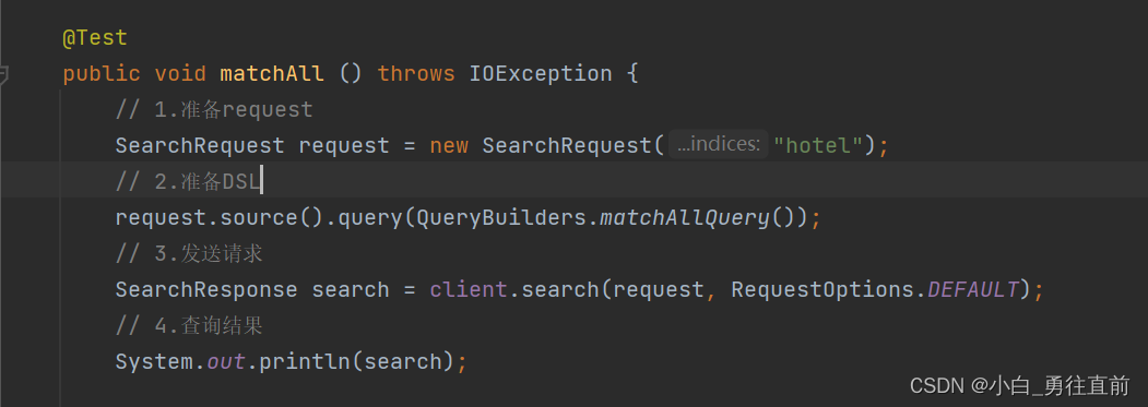 举例:request.source().query(QueryBuilders.matchQuery("all","皇冠假日"));