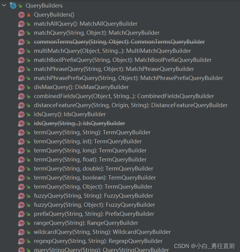RestAPI中其中构建查询条件的核心部分是由一-个名为QueryBuilders的工具类提供的,其中包含了各种查询方法: